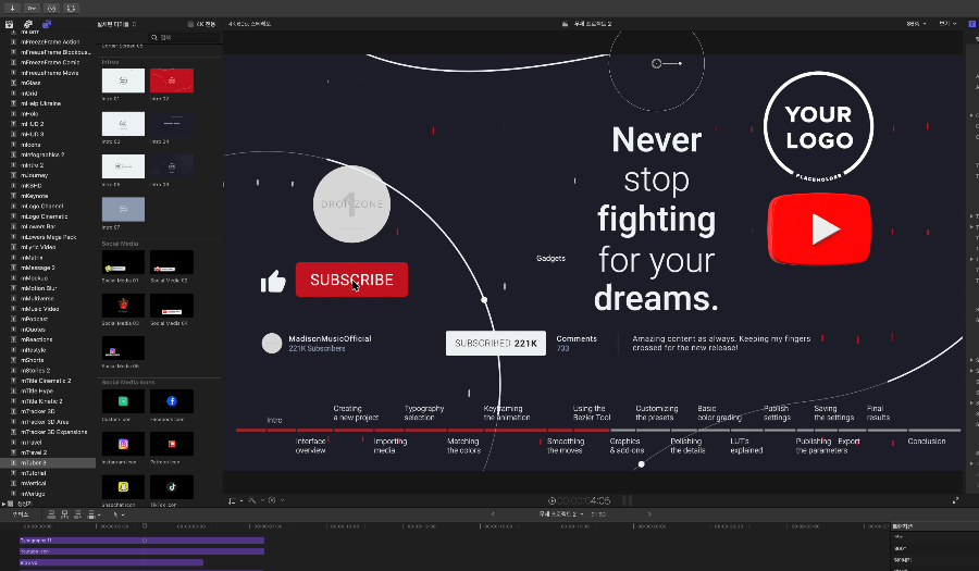 타이틀 플러그인 유닛들이 67가지가 된다. 백그라운드, 콜투액션, 챕터바, 코너스크린, 인트로, 소셜미디어, 소셜아이콘, 툴, 타이포그래피의 9가지 분류로 타이틀 플러그인이 나누어져있다. 트랜지션은 5가지가 있다. 우선 백그라운드부터 설명 하자면 백그라운드의 전체화면이 움직이는 애니메이션이 있다. 아마 이런 플러그인을 처음 접하는 유튜버들 이라면 매우 신기해 하고 기뻐할 것 같은 느낌이 든다. 백그라운드에서부터 움직임이 있으니 이 얼마나 감탄이 나오겠는가? 거기에 유명 유튜버들이라면 대부분 사용하고 있는 콜투액션으로 구독과 좋아요도 매우 쉽게 만들수 있다. 퀄리티도 여태까지 본인이 봐 왔던 유튜버들보다 웬만해선 더 높아 보인다. 또 멋드려져 보이는 소셜 아이콘들까지 3D 느낌도 나고 모든게 다 애니메이션으로 움직임을 선사한다. 인트로는 뭔가 봤더니 유어로고라고 영어로 친절하게 알려주고있다. 거기에 드랍존이라고 너의 사진이나 로고 한번 넣어 봐 라고 화살표로 친절하게 가르키고 있다. 그래서 사진을 첨부해 봤더니 헐리우드에서나 볼 법한 21세기 폭스사의 느낌처럼 웅장한 인트로가 되어 버리는 신세계를 경험한 것이다. 내가 지금 방송국 경력 20년은 족히 된 듯한 실력이 하루아침에 탑재된 듯한 기분이 든다. 추가로 툴이랑 타이포그래피까지 넣어보니 이건 뭐 도깨비방망이로 금나와라 하면 금이 바로 나오는 수준으로 영화가 만들어진다. 마치 본인이 하루아침에 스티브 스필버그가 된 듯한 느낌이 날것이다......