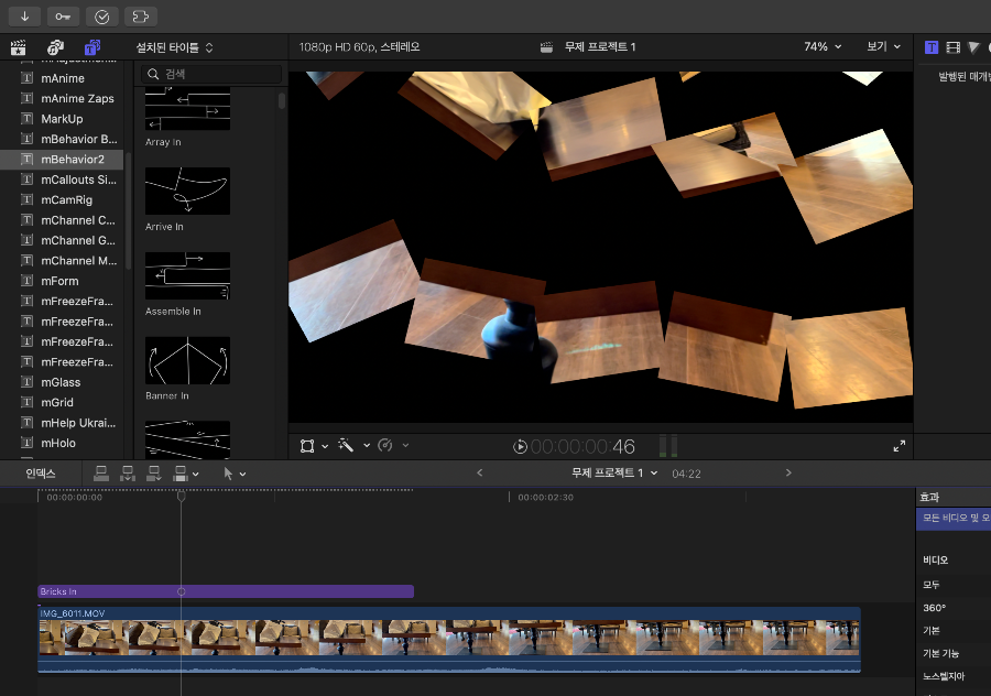 사용 방법에 있어서는 응용 할 수가 있다. 우선 직접적으로 바로 스토리라인에 바로 올려놓아도 된다. 클립과 클립 사이에 넣으면 트랜지션같은 효과도 낼 수가 있다. 그리고 무엇보다 움직임이 없는 아이콘에 플러그인을 적용하고 컴파운드로 묶어 줄수있다. 이렇게 사용하면 흡사 본인이 모션을 이용하여 애니메이션을 만들어내는 느낌을 연출 할수가 있다. 사용방법에 따라 누구는 클립위주의 전체적인 효과를 넣고 싶을 것이고 누구는 아이콘 위주로 넣고 싶어 할수 있다. 이 큰 부류의 사용방법만 응용해도 엄청나게 다양한 효과를 연출 할 수가 있는 것이다. 다시한번 말하지만 우선 무료로 사용해 보길 바란다. 무료버전에서도 유료와 똑같이 응용 할수가 있다. 그리고 본인이 원하는 효과에 좀 더 멋드러진 걸 만들어 내고 싶다면 그때 유료를 가길 바란다.